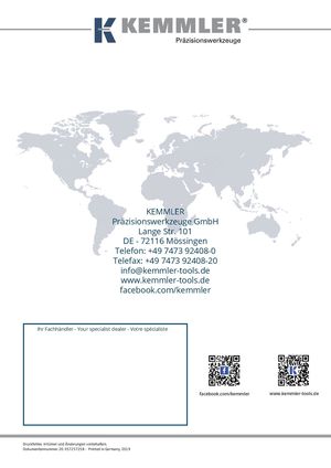 2018.NL.GR.BMT1 facebook.com/kemmler www.kemmler-tools.de KEMMLER Präzisionswerkzeuge GmbH Lange Str. 101 DE - 72116 Mössingen Telefon: +49 7473 92408-0 Telefax: +49 7473 92408-20 info@kemmler-tools.de www.kemmler-tools.de facebook.com/kemmler Ihr Fachhändler - Your specialist dealer - Votre spécialiste Kemmler Präzisionswerkzeuge GmbH Lange Str. 101 72116 Mössingen facebook.com/kemmler www.kemmler-tools.de Deutschland Telefon: +49 7473 92408-0 Telefax: +49 7473 92408-20 info@kemmler-tools.de www.kemmler-tools.de DDroukcukmfeehnlteer,nInrrutmümmfeearruc2ne0d-b3Ä5on7do2ek5ru7.nc2go5e8mn-v/oPrkrbineethmeadltmiennGl.eerrmany, 2019