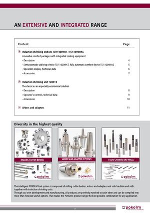 An extensive and integrated range Content Page uu Induction shrinking stations TSI11000WKT / TSI11000WKS innovative comfort packages with integrated cooling equipment - Description 4 - Semiautomatic table top device TSI11000WKT, fully automatic comfort device TSI11000WKS 5 - Operation display, technical data 6 - Accessories 7 uu Induction shrinking unit TSI3510 The classic as an especially economical solution - Description 8 - Operator's controls, technical data 9 - Accessories 10 uu Arbors and adapters 11 Diversity in the highest quality milWlEiNnDgEcPuLAtTtTeErNFbRoÄdSEiRes arborAaUnFNdAaHdMaESpYtSeTrEMsyEstems solid carbide end mills Werkzeugsysteme und Anwendungsberatung für die Zerspanung komplexer 2,5 und 3D-Geometrien Werkzeugsysteme und Anwendungsberatung für die Zerspanung komplexer 2,5 und 3D-Geometrien Titelseite Aufnahmen 2016.indd 1 25.02.16 13:15 The intelligent Pokolm tool system is composed of milling cutter bodies, arbors and adapters and solid carbide end mills together with induction shrinking units. Through our own development and manufacturing, all products are perfectly matched to each other and can be compiled into more than 500,000 useful options. That makes the Pokolm product range the best possible combination for any application. 3
