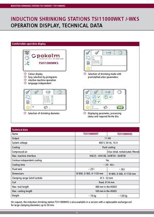 induction shrinking stations TSI11000WKT / TSI11000WKS Induction shrinking stations TSI11000WKT /-WKS Operation display, technical data Comfortable operation display uu Colour display uu Selection of shrinking mode with uu Easy selection by pictograms preinstalled arbor parameters uu intuitive machine operation uu language independent uu Selection of shrinking diameter uu Displaying parameter, processing status and required ferrite disc Technical data Name TSI11000WKT TSI11000WKS Output 11 kW System voltage 400 V, 50 Hz, 16 A Cooling Fluid cooling Compressed air - 4 bar (dried, nonlubricated, filtered) Max. machine interface HSK25 - HSK100, SK/BT30 - SK/BT50 Contour-independent cooling Yes Cooling time ~ 20 - 40 s Fluid tank ~ 25 l ~ 50 l Dimensions W 800, D 560, H 1130 mm W 800, D 560, H 1720 mm Clamping range Solid Carbide Ø 3 - 32 mm Coil fixed, Ø 54 mm Max. tool length 400 mm in the HSK63 Max. cooling length 160 mm in the HSK63 Weight ~ 70 kg ~ 120 kg On request, the induction shrinking station TSI11000WKS is also available in a version with a replaceable exchange-coil for large clamping diameters up to 50 mm. 6