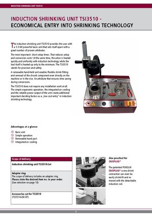 Induction shrinking unit TSI3510 Induction shrinking unit TSI3510 - Economical entry into shrinking technology The induction shrinking unit TSI3510 provides the user with a 3.5 kW powerful basic unit that sets itself apart with a great number of proven attributes. The most important: short setup times. That reduces setup and conversion costs! At the same time, the arbor is heated quickly and uniformly with induction technology while the tool itself is heated up only to the minimum. The TSI3510 stands for precision and safety. A removable hand-held unit enables flexible shrink fitting and removal of the shrunk component even directly on the machine or in the vice. An attribute that ensures time saving during conversions. The TSI3510 does not require any installation work at all. The simple ergonomic operation, the integrated air cooling and the reliable power output of the unit create additional important deciding factors as a „low cost entry“ in induction shrinking technology. Advantages at a glance uu Basic unit uu Simple operation uu Removable hand part uu Integrated air cooling Scope of delivery Also practical for DuoPlug® Induction shrinking unit TSI3510-Set The patented Pokolm DuoPlug® screw-shrink Adapter ring connection can even be The scope of delivery includes an adapter ring. easily shrink-fit and re- Please state the desired item no. in your order. moved with the detachable (See selection on page 10) induction coil. Accessories set for TSI3510 (TSI3510-ZB-SET) 8