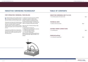 u PRODUCTINFORMATION TSI 3510 u PRODUCTINFORMATION TSI 3510 INDUCTIVE SHRINKING TE C H N O L O G Y TABLE OF CONTENTS FIRST OPERATION: SHRINKING, THEN MILLING INDUCTION SHRINKING UNIT TSI 3510 u fast shrinking operation with maximum safety Page 4 S Shrinking Technology convinces everybody comparedwith conventional chucking methods from the past.For applications with extended requirements, POKOLMhas developed a complete new Adaptor-System: What counts? Absolute concentricity and highest precision. DuoPlug® a combination of screwing and shrinking. This unique and patent protected technology secures This guarantees much longer tool life. Shrinking Technology absolute concentricity and rigidity – also with long reach TECHNICAL DATA secures also a safe load transmission and an extremely adaptors and roughing with High Speed Technology. u operators control and accessories Page 5 high torque- and balance quality. Its capability for extended revolutions is the best assumption for getting Pokolm-Voha offers for Shrinking Technology a highly optimum surface quality in order to save expensive finish qualified range: processes. u a top-class Induction Shrinking Unit u Shrinking arbors for all possible machine connections SUITABLE ARBOR CONNECTIONS Compared with usual Milling Chucks, Shrinking Arbors u our Milling Cutter Bodies DuoPlug® u for shrinking process Page 6 allow distinctly slim adaptors and extend the variety of u our Solid Carbide Adaptors DuoPlug® applications, which would be impossible without this u our “zero-reach” Shrinking Arbors most modern process. (additional information about the POKOLM DuoPlug® System can be found under chapter “Milling Cutter Bodies” of our catalogue.) POKOLM DuoPlug® u the combination clamping system Page 7 TSI 3510 2 3