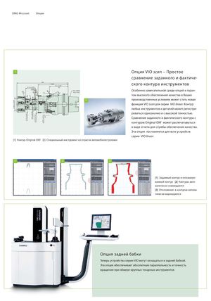 R0.8 21° R0.8 23° ø 54,6 ± 0,05* ø 75 ± 0,05* ø 61 ± 0,05* (ø 84,92 EM) ø 107 ± 0,1 * ø 85,25 EMS5 ADJUSTED DMG Microset Опции 1 Опция VIO scan – Простое сравнение заданного и фактиче- 250 146,8 ского контура инструментов 91 ± 0,05 * 47,4 ± 0,05* S5 2,3515° R0.8 DIN 69893-HSK-A100 Особенно замечательной среди опций и гаран- том высокого обеспечения качества в Ваших 2 производственных условиях может стать новая функция VIO scan для серии VIO linear. Контур любых инструментов и деталей может регистри- роваться однозначно и с высокой точностью. Сравнение заданного и фактического контура с контуром Original-DXF может распечатываться в виде отчета для службы обеспечения качества. Эта опция поставляется для всех устройств серии VIO linear. |1| Контур Original-DXF |2| Специальный инструмент из отрасли автомобилестроения 1 2 3 |1| Заданный контур и отсканиро- ванный контур |2| Контуры авто- матически совмещаются |3| Отклонения в контурах автома- тически маркируются Опция задней бабки Теперь устройства серии VIO могут оснащаться и задней бабкой. Эта опция обеспечивает абсолютную параллельность и точность вращения при обмере крупных токарных инструментов