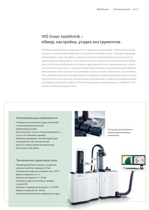 DMG Microset VIO linear toolshrink 12 | 13 VIO linear toolshrink – обмер, настройка, усадка инструментов. VIO linear обеспечивает преимущества по времени по сравнению с обычными устрой- ствами и в исполнении toolshrink со встроенным блоком усадки. Линейные приводы обеспечивают очень быстрое и точное до микрона позиционирование осей и в то же время бережно обращаются с инструментальной и термоусадочной катушкой. Кроме того, отсутствие необходимости в замене переходной втулки и автоматическая усадоч- ная стяжка инструментов с диаметром хвостовика большего диаметра режущей кромки обеспечивает самое простое обслуживание в своем сегменте. Кроме того, интуитивное обслуживание позволяет быстро вводить устройство в рабочий режим и предоставляет пользователю долгосрочные преимущества. Дооснащение устройства предварительной настройки инструмента серии VIO linear усадочным стяжным блоком „toolshrink“ воз- можно и на более позднем этапе. Отличительные особенности _ Оптимальные результаты усадки независимо от производителя крепления _ Превосходный захват Pick by Light для правильного _ Более быстрое / точное позиционирование на выбора взаимозаменяемых оси за счет линейного привода компонентов _ Бережное обращение с блоком индукторов (без давления собственным весом) _ Доступ к сервису панели без демонтажа блок какого-либо блока Технические характеристики _ Перемещение блока суппорта / индуктора включая линейные приводы: 570 мм _ Температура усадочного патрона: макс. 350° C _ Время нагревания: ок. 4 с _ Диаметр инструмента: 4 – 32 мм _ Материал усадочного патрона: твердый сплав и HSS _ Мощность индукционной усадки: 13 / 20 KVA _ Время охлаждения: 30 – 60 сек. _ Автоматический контроль параметров усадки