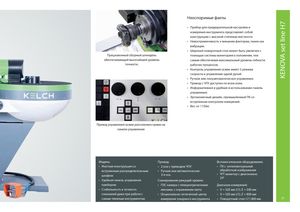 KENOVA set line H7 Неоспоримые факты • Прибор для предварительной настройки и измерения инструмента представляет собой конструкцию с высокой степенью жесткости • Невосприимчивость к внешним факторам, таким как вибрации. • Широкий поворотный стол может быть увеличен с Прецизионный сборный шпиндель помощью системы мониторинга положения, тем обеспечивающий высочайший уровень самым обеспечивая максимальный уровень гибкости точности. рабочих процессов. • Контроль управления осями имеет 3 режима скорости и управление одной рукой. • Ручное или полуавтоматическое управление. • Привод с ЧПУ доступен по всем осям. • Информативная и удобная в использовании панель управления. • Эргономичный дизайн, промышленный ПК со встроенным контролем измерений. • Вес: от 1150кг Привод управления осями расположен прямо на панели управления Модель: Привод: Вспомогательное оборудование: • Жесткая конструкция со • 2 оси с приводом ЧПУ • ПК с интеллектуальной встроенным распределительным • Ручная или автоматическая обработкой изображения шкафом 3-я ось • TFT монитор с диагональю 24" • Удобная панель управления Сканирование режущей кромки: прибором • ПЗС камера с телецентрическими Диапазон измерений: • Стабильность и точность линзами, с отражением света • X = 520 мм (∅); Z = 500 мм показаний даже при работе с • Опционально: оптический центр • X = 520 мм (∅); Z = 800 мм самым тяжелым инструментом измерения токарного инструмента • Поворотный стол (∅) 800 мм 21