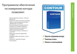 CONTOUR Contour Software Программное обеспечение по измерению контура CONTOUR позволяет: CONTOUR • Простое сравнение контура, используя формат DXF • Измерение любой геометрической формы • Прямые и круговые формы могут быть сформированы из отрезков • Всесторонний анализ осуществляется с помощью использования подсказок • Измерение фасонного инструмента с прямой и винтовой канавкой • Сканирование контура с помощью 3-х осей с ЧПУ • Интуитивно понятный графический интерфейс • Измерение любого расстояния, углов и Простое сохранение контура радиусов • Сравнение с заданным контуром Понятные отчеты • Учет допусков Легкость в использовании 29