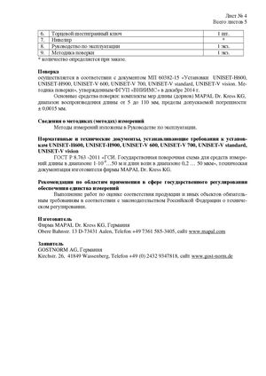 Лист № 4 Всего листов 5 6. Торцевой шестигранный ключ 1 шт. 7. Нивелир * 8. Руководство по эксплуатации 1 экз. 9. Методика поверки 1 экз. * количество определяется при заказе. Поверка осуществляется в соответствии с документом МП 60382-15 «Установки UNISET-H600, UNISET-H900, UNISET-V 600, UNISET-V 700, UNISET-V standard, UNISET-V vision. Ме- тодика поверки», утвержденным ФГУП «ВНИИМС» в декабре 2014 г. Основные средства поверки: комплекты мер длины (дорнов) MAPAL Dr. Kress KG, диапазон воспроизведения длины от 5 до 110 мм, пределы допускаемой погрешности ± 0,0015 мм. Сведения о методиках (методах) измерений Методы измерений изложены в Руководстве по эксплуатации. Нормативные и технические документы, устанавливающие требования к установ- кам UNISET-H600, UNISET-H900, UNISET-V 600, UNISET-V 700, UNISET-V standard, UNISET-V vision ГОСТ Р 8.763 -2011 «ГСИ. Государственная поверочная схема для средств измере- ний длины в диапазоне 1·10-9…50 м и длин волн в диапазоне 0,2 … 50 мкм», техническая документация изготовителя фирмы MAPAL Dr. Kress KG. Рекомендации по областям применения в сфере государственного регулирования обеспечения единства измерений Выполнение работ по оценке соответствия продукции и иных объектов обязатель- ным требованиям в соответствии с законодательством Российской Федерации о техниче- ском регулировании. Изготовитель Фирма MAPAL Dr. Kress KG, Германия Obere Bahnstr. 13 D-73431 Aalen, Telefon +49 7361 585-3405, сайт www.mapal.com Заявитель GOSTNORM AG, Германия Kirchstr. 26, 41849 Wassenberg, Telefon +49 (0) 2432 9347818, сайт www.gost-norm.de