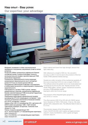 Наш опыт - Ваш успех Our expertise: your advantage Материал основания и стойки: высокопрочный Basic material and tower from high-strength, tension-free свободный от внутренних напряжений сплав из легких light metal alloy. металлов. На высоте 200мм погрешность радиального биения With reference to a height of 200 mm, the concentric составляет менее 5 микрон благодаря точности accuracy is within 5 microns due to the precision of the tool инструментальной оправки (запатентованный PWB holder (PWB patented needle bearing). игольчатый подшипник). Погрешность параллельности после коррекциимеханической параллельности оси Z составляетменее 0.010 мм на отрезке длиной 200 мм.Программное обеспечение позволяет пользователюParallel error after correction of the mechanical parallelity ofthe z-axis is less than 0.010 mm over a length of 200 mm.The software allows the parallel error to be recalculated and в любое время вычислять и корректировать погрешность corrected at any time by the user. Repeat precision of the параллельности. whole PWB system, camera, guges, mechanical concentric Повторяемость системы PWB в целом: камеры, accuracy (PWB patented needle измерительных эталонов, механическое радиальное bearing) is within the 5 micron range. биение (запатентованный PWB игольчатый подшипник) находится в пределах 5 микрон. The precision of the integrated glass gauges by Разрешение индуктивной измерительной линейки ACU-RITE is 1 micron. производства SYLVAC (Швейцария) составляет 1 мкм. Точность встроенной стеклянной оптической линейки The uEye camera USB 2.0 by IDS with e2v CMOS sensor ACU-RITE составляет 1 микрон. has a resolution of 1280 x 1024 pixels. It has ca. 30x enlar- Камера uEye USB 2.0 производства IDS с датчиком e2v CMOS имеет расширение 1280 х 1024 пикселя.Увеличение примерно 30-кратное. Полезное поле9 x 5 mm. обзора 9 х 5 мм.Классы точности направляющих INA: The precision classes of the INA guides are: ось Х: KUVE15-B-ESC (с 4 направляющими каретками), X-axis: KUVE15-B-ESC (with 4 guide carriages) precision класс точности G1. class G1. Z-axis: KUVE20-B-L (with 2 guide carriages) Ось Z: KUVE20-B-L (с 2 направляющими каретками), precision class G1. класс точности G1. 24 | www.evoset.com ST-GROUP www.s-t-group.com