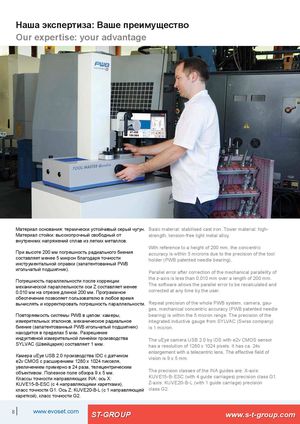 Наша экспертиза: Ваше преимущество Our expertise: your advantage Материал основания: термически устойчивый серый чугун. Basic material: stabilised cast iron. Tower material: high- Материал стойки: высокопрочный свободный от strength, tension-free light metal alloy. внутренних напряжений сплав из легких металлов. With reference to a height of 200 mm, the concentric При высоте 200 мм погрешность радиального биения accuracy is within 5 microns due to the precision of the tool составляет менее 5 микрон благодаря точности holder (PWB patented needle bearing). инструментальной оправки (запатентованный PWB игольчатый подшипник). Parallel error after correction of the mechanical parallelity of Погрешность параллельности после коррекциимеханической параллельности оси Z составляет менееthe z-axis is less than 0.010 mm over a length of 200 mm.The software allows the parallel error to be recalculated and 0.010 мм на отрезке длиной 200 мм. Программное corrected at any time by the user. обеспечение позволяет пользователю в любое время вычислять и корректировать погрешность параллельности. Repeat precision of the whole PWB system, camera, gau- ges, mechanical concentric accuracy (PWB patented needle Повторяемость системы PWB в целом: камеры, bearing) is within the 5 micron range. The precision of the измерительных эталонов, механическое радиальное integrated inductive gauge from SYLVAC (Swiss company) биение (запатентованный PWB игольчатый подшипник) is 1 micron. находится в пределах 5 мкм. Разрешение индуктивной измерительной линейки производства The uEye camera USB 2.0 by IDS with e2v CMOS sensor SYLVAC (Швейцария) составляет 1 мкм. has a resolution of 1280 x 1024 pixels. It has ca. 24x Камера uEye USB 2.0 производства IDC с датчикомe2v CMOS с расширением 1280 х 1024 пикселя,vision is 9 x 5 mm. увеличением примерно в 24 раза, телецентрическимобъективом. Полезное поле обзора 9 х 5 мм.The precision classes of the INA guides are: X-axis: Классы точности направляющих INA: ось Х: KUVE15-B-ESC (with 4 guide carriages) precision class G1. KUVE15-B-ESC (с 4 направляющими каретками), Z-axis: KUVE20-B-L (with 1 guide carriage) precision класс точности G1. Ось Z: KUVE20-B-L (с 1 направляющей class G2. кареткой), класс точности G2. 8| www.evoset.com ST-GROUP www.s-t-group.com