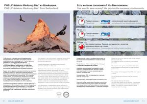 PWB „Präzisions Werkzeug Bau“ из Швейцарии. Есть желание сэкономить? Мы Вам поможем. PWB „Präzisions Werkzeug Bau“ from Switzerland. You want to save money? We provide the necessary instruments. 50 сек. sec Предустановка с и электронной идентификацией. Preset with and electonic tool identification system. 70 сек. sec Предустановка с Preset with 250 сек. sec Без предустановки. Замена инструмента и оснастки непосре. дственно на станке. Without presetting. Toolchange and setting inside machine. PWB systems – торговая марка оборудования для PWB systems is the brand name for presetting devices which Измерительная стойка и основание выполнены из Measuring column and base are made of high-strength, предварительной настройки инструмента,которое are developed and manufactured in Brig at the foot of the высокопрочного ненапряженного сплава из легких distressed light alloy. разрабатывается и производится в г. Бриг у подножия world-famous Matterhorn. металлов. The measuring column is moved on 4 recirculating знаменитого горного массива Маттерхорн. ball guides. Продукцию марки PWB systems можно увидеть Products of the brand PWB systems can be found in Измерительная стойка перемещается с помощью на производственных предприятиях по всему миру. production plants all over the world. 4 шариковых направляющих качения. Top precision linear guides, pre-loaded in both axes, Главная цель продукции PWB systems - оптимальноевыполнение индивидуальных требований заказчика.The focus of the products lies in the optimum implementationБудучи частью крупной инжиниринговой группы компаний,of the individual customer requirements. As part ofЛинейные направляющие высочайшего классаточности с предварительным натягом по обеимосям гарантируют точность измерения даже вensure measuring accuracy even in rough workshopenvironments. Evoset AG стремится обеспечить интеллектуальные, a strong engineering group, Evoset AG pursues intelligent, тяжелых условиях цеха. The precision of the integrated ACU-RITE glass scale is взаимодополняющие решения с наилучшим соотношением 1 micron. цены и эксплуатационных показателей. Это позволяет ratio. This allows companies with machine parks to utilise Направляющие INA изготавливаются с высоким предприятиям, располагающим собственным парком the capacity of their capital-intensive CNC machines to an классом точности G1. The INA guides are produced in the high precision станков, использовать мощности капиталоемких станков even greater degree and to increase their productivity by an class G1. с ЧПУ в еще большей степени и увеличить их average of 25 % per unit. As a partner to the production Привод осей от электродвигателей постоянного тока. производительность примерно на 25% на единицу. industry, Evoset AG is constantly developing new devices The axes are driven by DC motors. and systems in order to further optimise industrial processes. Возможен выбор между двумя базовыми скоростями Two basic feed speeds can be selected. The following Собственные разработки новейших средств измерения и подачи. Затем скорость можно плавно регулировать speed may be adjusted continuously by means of the программного обеспечения, а также монтаж оборудования Own development of measurement devices, software, in- при помощи джойстика. Таким образом, измерительные joystick. This allows for precise positioning of the и инжиниринговые услуги гарантируют то, что заказчик stallation as well as our own engineering crew guarantee the салазки можно позиционировать с точностью до микрон. measuring carrier in µ-range. получит продукцию и сервис высочайшего качества,отвечающих всем современным запросам техническогопрогресса.necessary know-how and success for your investments ascontinuity is always ensured. 2| www.pwb-systems.com www.pwb-systems.com |3