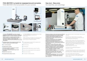 TOOL MASTER 5, устройство предварительной настройки. Наш опыт - Ваш успех. TOOL MASTER 5, the tool presetter for your success. Our expertise: your advantage. Прожектор PC с сенсорным дисплеем Устройство TOOL MASTER 5 может быть оснащено The TOOL MASTER 5 may be equipped with the pc-based Материал основания и стойки: высокопрочный свободный Basic material and tower from high-strength, tension-free light программным обеспечением для обработки изображений image software EyeRay ® as well as with an от внутренних напряжений сплав из легких металлов. metal alloy. EyeRay ® на базе ПК, а также оптическим проектором. optical projector. При высоте 200мм погрешность радиального биения Наличие надежных поставщиков известных марок,элементы конструкции, оптимизированные для простотыReliable, established sub-suppliers, and components whichи доступности сервиса во многих странах мира,are optimised for simple, worldwide service exchange,обеспечивают длительнную бесперебойную эксплуатациюensure long-years of trouble free operation.оборудования.составляет менее 5микрон благодаря точностиWith reference to a height of 200 mm, the concentricинструментальной оправки (запатентованный PWBaccuracy is within 5 microns due to the precision of the toolигольчатый подшипник).holder (PWB patented needle bearing).Погрешность параллельности после коррекциимеханической параллельности оси Z составляетменее 0.010 мм на отрезке длиной 200 мм.Программное обеспечение позволяет пользователюParallel error after correction of the mechanical parallelity ofthe z-axis is less than 0.010 mm over a length of 200 mm. The Напряжение питания 12 В для управления системой точной в любое время вычислять и корректировать погрешность software allows the parallel error to be recalculated and cor- настройки и пневматической системой шпинделя. the pneumatics for the spindles. параллельности. rected at any time by the user. Repeat precision of the whole Повторяемость системы PWB в целом, камеры, PWB system, camera, guges, mechanical concentric accura- Оси с электроприводом. Motor-driven axes. измерительных эталонов, механическое радиальное cy (PWB patented needle биение (запатентованный PWB игольчатый подшипник) bearing) is within the 5 micron range. Пневматическая установка. Air servicing unit. находится в пределах 5 микрон. Точность встроенного Игольчатый подшипник стандартного шпинделя.Как опция возможен шпиндель KV.Standard spindle needle bearing, optional KV spindle. индуктивного измерительного эталона производства The precision of the integrated glass gauges bySYLVAC (Швейцария) составляет 1 микрон.ACU-RITE is 1 micron.Точность встроенной стеклянной оптической линейки Эргономично размещенный джойстик для точной ACU-RITE составляет 1 микрон. The uEye camera USB 2.0 by IDS with e2v CMOS sensor has регулировки. Камера uEye USB 2.0 производства IDS с датчиком e2v a resolution of 1280 x 1024 pixels. It has ca. 30x enlargement Выборочный прижим осей. Selective axis clamping. CMOS имеет расширение 1280 х 1024 пикселя.Увеличение примерно 30-кратное. Полезное поле Инструментальный шкаф как опция. A tool cabinet is available optionally. обзора 8 х 5 мм.Классы точности направляющихINA: ось Х: KUVE20-B(с 4 направляющими каретками), класс точности G1.The precision classes of the INA guides are:X-axis: KUVE15-B-ESC (with 4 guide carriages) precision Ось Z: KUVE20-B (с 2 направляющими каретками), class G1. Z-axis: KUVE20-B-L (with 2 guide carriages) класс точности G1. precision class G1. 4| www.pwb-systems.com www.pwb-systems.com |5
