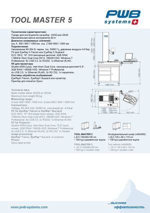 1300 mmZ600:860 mm mm1600Z1000:Z900 /845 mm770 mm 1060 mm TOOL MASTER 5 Технические характеристики: Гнездо для инструмента на выбор SK50 или SK40 Максимальная масса инструмента 80 кг Диапазон измеряемых значений: ось Х 400 / 600 / 1000 мм, ось Z 600 /900 / 1000 мм Подключение: Напряжение 90-264 В, перем. ток, 50/60 Гц, давление воздуха 4-6 бар ПК для EyeRay ® Falcon или EyeRay ® Buzzard: ELO 19C2, 19” 16:9 сенсорный дисплей, 4GB RAM, 1.66GHz Atom Dual Core D512, 160GB HDD. Windows 7 Professional. 6x USB 2.0, 2x RS232, 1x Ethernet (RJ45) ПК для проектора: Shuttle X50V2 plus, Intel Atom Dual Core, сенсорный дисплей15.6” , 2GB RAM / 160GB HDD. Windows 7 Professional. 4x USB 2.0, 1x Ethernet (RJ45), 2x RS 232, 1x параллель. Системы обработки изображений: EyeRay® Falcon, EyeRay® Buzzard или проектор. Принтер для этикеток Dymo 1000 mm Technical data:Basic holder either ISO50 or ISO40 R 825 Maximum tool weight 80 kg Measuring range: X-axis 400 / 600 / 1000 mm, Z-axis 600 / 900 / 1000 mm Connections: Voltage: 90-264 VAC 50/60 Hz, comressed air: 4-6 bar X400: 926 mm PC for EyeRay ® Falcon or EyeRay ® Buzzard:ELO 19C2, 19” 16:9 single touch screen, 4GB RAM, X600: 1026 mmX1000:1286 mm945 mm 1.66GHz Atom Dual Core D512, 160GB HDD. Windows 7 Professional. 6x USB 2.0, 2x RS232, 1x Ethernet (RJ45) PC for Projector: Shuttle X50V2 plus, Intel Atom Dual Core, 15.6” touch screen, 2GB RAM / 160GB HDD. Windows 7 Professional. 4x USB 2.0, 1x Ethernet (RJ45), 2x RS 232, 1x Parallel Image processing: TOOL MASTER 5 Инструментальный шкаф (x400/600) EyeRay ® Falcon, EyeRay ® Buzzard, or projector L,B,H 150x90x180 cm L,B,H 120 x 80 x 110 cm Printer: ~ 350 kg в деревянном ящике ~ 109 kg в деревянном ящике Dymo label printer TOOL MASTER 5 Tool cabinet (x400/600) L, W, H 150x90x180 cm L, W, H 120 x 80 x 110 cm ~ 350 kg in wooden crate ~ 109 kg in wooden crate ...высокая 6| wwww.wpww.pbw-sby-ssytestmemss.c.coomm эффективность