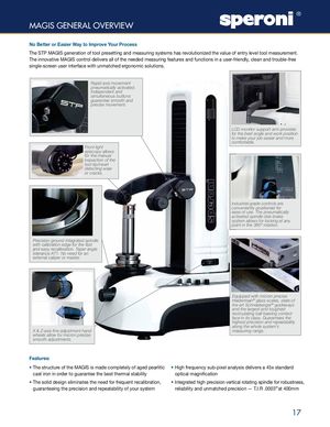 MAGIS GENERAL OVERVIEW No Better or Easier Way to Improve Your Process The STP MAGIS generation of tool presetting and measuring systems has revolutionized the value of entry level tool measurement. The innovative MAGIS control delivers all of the needed measuring features and functions in a user-friendly, clean and trouble-free single-screen user interface with unmatched ergonomic solutions. Rapid axis movement pneumatically activated. Independent and simultaneous buttons guarantee smooth and precise movement. LCD monitor support arm provides for the best angle and work position to make your job easier and more comfortable. Front light episcopy allows for the manual inspection of the tool tip/insert detecting wear or cracks. Industrial grade controls are conveniently positioned for ease of use. The pneumatically activated spindle disk brake system allows for locking at any point in the 360º rotation. Precision ground integrated spindle with calibration edge for the fast and easy recalibration. Taper angle tolerance AT1. No need for an external caliper or master. Equipped with micron precise Heidenhain® glass scales, state of the art Schneeberger® guideways and the largest and toughest recirculating ball bearing contact face in its class. Guarantees the highest precision and repeatability along the whole system’s X & Z-axis fine adjustment hand measuring range. wheels allow for micron precise smooth adjustments. Features: • The structure of the MAGIS is made completely of aged pearlitic • High frequency sub-pixel analysis delivers a 45x standard cast iron in order to guarantee the best thermal stability optical magnification • The solid design eliminates the need for frequent recalibration, • Integrated high precision vertical rotating spindle for robustness, guaranteeing the precision and repeatability of your system reliability and unmatched precision — T.I.R .0003" at 400mm 17