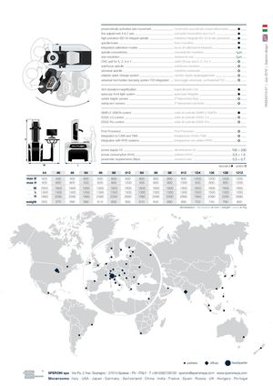 Speroni design|July 2019|750004215-07 pneumatically activated axis movement movimento assi attivato pneumaticamente z fine adjustment X & Z axis comandi micrometrici assi X e Z z high precision ISO 50 integral spindle mandrino integrale ISO 50 di alta precisione z spindle brake freno mandrino z integrated calibration master tacca di calibrazione integrata z spindle concentricity concentricità mandrino 1µm axis resolution risoluzione assi 1µm CNC unit for X, Z, A e Y unità CN per assi X, Z, A e Y z autofocus spindle autofocus mandrino z universal spindle mandrino universale z adapter quick change system cambio rapido equipaggiamenti z universal tool-holder clamping system F20 integrated bloccaggio universale portautensili F20 z 45X standard magnification ingrandimento 45x z episcopy front light system episcopia integrata z centre height camera 2ª telecamera fissa z swing arm camera 2ª telecamera pivotante z SIMPLE VISION control unità di controllo SIMPLE VISION z EDGE 2.0 control unità di controllo EDGE 2.0 z EDGE Pro control unità di controllo EDGE Pro z Post Processor Post Processor z integration to CAM and TMS integrazione CAM e TMS z H Integration with RFID systems integrazione con sistemi RFID z power supply (V) alimentazione (V) 100 ÷ 230 power consumption (KVA) potenza (KVA) 0.5 ÷ 1.5 pneumatic requirements (Mpa) consumo aria 0.5 ÷ 0.7 W L standard z option 44 46 48 64 66 68 612 84 86 88 812 124 126 128 1212 max Ø 400 400 400 600 600 600 600 800 800 800 800 1200 1200 1200 1200 max H 400 600 800 400 600 800 1200 400 600 800 1200 400 600 800 1200 W 1600 1600 1600 1600 1600 1600 1600 1600 1600 1600 1600 1600 1600 1600 1600 L 1300 1300 1300 1300 1300 1300 1300 1350 1350 1350 1350 1550 1550 1550 1550 H 1890 2090 2290 1890 2090 2290 2690 1890 2090 2290 2690 1890 2090 2290 2690 weight 550 570 590 590 610 630 650 610 640 660 680 720 740 760 800 dimensions / dimensioni in mm | weight / peso in Kg partners offices headquarter SPERONI spa . Via Po, 2 fraz. Sostegno - 27010 Spessa - PV - ITALY . T +39 0382729720 . speroni@speronispa.com . www.speronispa.com Showrooms . Italy . USA . Japan . Germany . Switzerland . China . India . France . Spain . Russia . UK . Hungary . Portugal