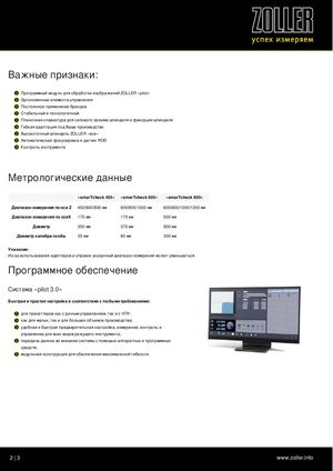 Важные признаки: Программный модуль для обработки изображений ZOLLER »pilot« Эргономичные элементы управления Постоянное применение брендов Стабильный и технологичный Пленочная клавиатура для силового зажима шпинделя и фиксации шпинделя Гибкая адаптация под Ваше производство Высокоточный шпиндель ZOLLER »ace« Автоматическая фокусировка и датчик ROD Контроль инструмента Метрологические данные »smarTcheck 450« »smarTcheck 600« »smarTcheck 800« Диапазон измерения по оси Z 450/600/800 мм 600/800/1000 мм 600/800/1000/1200 мм Диапазон измерения по осиX 175 мм 175 мм 500 мм Диаметр 350 мм 370 мм 900 мм Диаметр калибра-скобы 35 мм 80 мм 300 мм Указание: Из-за использования адаптеров и оправок указанный диапазон измерения может уменьшаться. Программное обеспечение Система »pilot 3.0« Быстрая и простая настройка в соответствии с любыми требованиями: для пресеттеров как с ручным управлением, так и с ЧПУ; как для малых, так и для больших объемов производства; удобная и быстрая предварительная настройка, измерение, контроль и управление для всех видов режущего инструмента; передача данных во внешние системы с помощью аппаратных и программных средств; модульная конструкция для обеспечения максимальной гибкости. 2|3 www.zoller.info