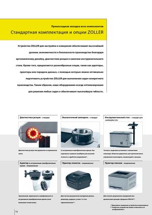 Превосходная наладка всех компонентов Стандартная комплектация и опции Zoller Устройства ZOLLER для настройки и измерения обеспечивают высочайший уровень экономичности и безопасности производства благодаря эргономичному дизайну, диагностике резцов и наличию инструментального стола. Кроме того, предлагаются разнообразные опции, такие как адаптеры, принтеры или передача данных, с помощью которых можно оптимально подготовить устройство ZOLLER для выполнения задач конкретного производства. Таким образом, наше оборудование всегда оптимизировано для решения любых задач и обеспечивает высочайшую гибкость. Диагностика резцов – стандарт Высокоточный шпиндель – стандарт Инструментальный стол – стандарт для »smile/pilot 3.0« Диагностика резцов инструментов в отраженном Со встроенным калибровочным краем, без Точная и надежная установка с элементами свете. отдельных нулевых калибров для высокой нивелира. Включая держатель для эргономичного точности и удобства управления*. управления монитором, клавиатурой и мышью. Адаптер со встроенным калибровочным Принтер этикеток – опционально Принтер списков – опционально краем – опционально Закаленный, вороненый и шлифованный со Для печати результатов измерения длины, Для печати результатов измерений или встроенным калибровочным краем (если диаметра, радиуса, углов 1 и 2 на диагностики резцов в формате DIN A4**. возможно технически). термоэтикетках**. * Вакуумное зажимное устройство опционально ** Реальное устройство может отличаться от изображенного 12
