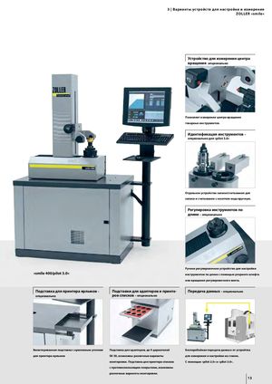 3 | Варианты устройств для настройки и измерения Zoller »smile« Устройство для измерения центра вращения опционально Позволяет измерения центра вращения токарных инструментов. Идентификация инструментов – опционально для »pilot 3.0« Отдельное устройство записи/считывания для записи и считывания с носителя кода вручную. Регулировка инструментов по длине – опционально Ручное регулировочное устройство для настройки »smile 400/pilot 3.0« инструментов по длине с помощью упорного штифта или вращения регулировочного винта. Подставка для принтера ярлыков – Подставки для адаптеров и принте- Передача данных – опционально опционально ров списков – опционально Вмонтированная подставка с крепежным уголком Подставка для адаптеров, до 9 держателей Бесперебойная передача данных от устройтва для принтера ярлыков SK 50, возможны различные варианты для измерения и настройки на станок. монтировки. Подставка для принтера списков С помощью »pilot 2.0« и »pilot 3.0«. с противоскользящим покрытием, возможны различные варианты монтировки. 13