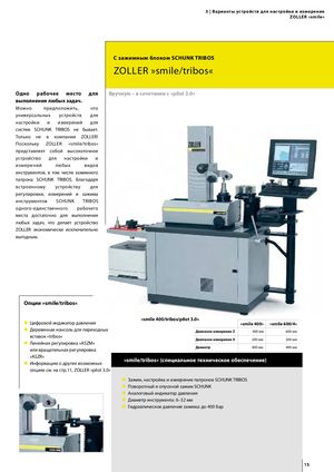 3 | Варианты устройств для настройки и измерения Zoller »smile« С зажимным блоком SCHUNK TRIBOS Zoller »smile/tribos« Одно рабочее место для Вручную – в сочетании с »pilot 3.0« выполнения любых задач. Можно предположить, что универсальных устройств для настройки и измерений для систем SCHUNK TRIBOS не бывает. Только не в компании ZOLLER! Поскольку ZOLLER »smile/tribos« представляет собой высокоточное устройство для настройки и измерений любых видов инструментов, в том числе зажимного патрона SCHUNK TRIBOS. Благодаря встроенному устройству для регулировки, измерений и зажима инструментов SCHUNK TRIBOS одного-единственного рабочего места достаточно для выполнения любых задач, что делает устройство ZOLLER экономически исключительно выгодным. Опции »smile/tribos« »smile 400/tribos/pilot 3.0« Цифровой индикатор давления »smile 400« »smile 600/4« Деревянная консоль для переходных Диапазон измерения Z 400 мм 600 мм вставок »tribos« Диапазон измерения X 200 мм 200 мм Линейная регулировка »ASZM« или вращательная регулировка Диаметр 400 мм 400 мм »ASZR« Информацию о других возможных »smile/tribos« (специальное техническое обеспечение) опциях см. на стр.11, ZOLLER »pilot 3.0« Зажим, настройка и измерение патронов SCHUNK TRIBOS Поворотный и опускной зажим SCHUNK Аналоговый индикатор давления Диаметр инструмента: 6–32 мм Гидравлическое давление зажима: до 400 бар 15