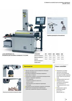 3 | Варианты устройств для настройки и измерения Zoller »smile« Удобное руководство пользователя »smile 600/EDM/pilot 3.0« »smile/EDM« 400 400/26 600 600/26 800 Уыстройство для настройки и измерения с 4-ю осями Диапазон измерения Z 400 мм 400 мм 600 мм 600 мм 800 мм Диапазон измерения X 300 мм 130 мм 300 мм 130 мм 300 мм Диаметр 600 мм 260 мм 600 мм 260 мм 600 мм Диапазон измерения Y ± 50 мм Калибр-скоба Ø 20 мм Преимущества Опции »smile/EDM« Простое, быстрое и точное измерение электродов Возможность поставки режущих инструментов адаптеров электродов Все важные параметры электрода измеряются для всех систем крепления менее чем за 1 минуту инструментов EDM, например Независимо от формы и назначения электрода можно Erowa, System 3R, Hirschmann измерить следующие параметры: и др. – угол смещения; Автофокусировка для оси С – смещение центров по осям X и Y; Передача данных – длина по оси Z; измерений, необходимых – щупы Renishaw для измерения параметров для управления, на электрода электроэрозионный станок Фотореалистичная программа измерения электродов с ЧПУ Графические инструкции для оператора для Информацию о других пошагового управления процессом измерения возможных опциях см. на стр.11, Решение для изготовления инструментов и форм. ZOLLER »pilot 3.0« 19