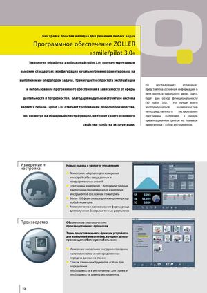 Быстрая и простая наладка для решения любых задач Программное обеспечение Zoller »smile/pilot 3.0« Технология обработки изображений »pilot 3.0« соответствует самым высоким стандартам: конфигурация начального меню ориентирована на выполняемые оператором задачи. Преимущество: простота эксплуатации На последующих страницах и использование программного обеспечения в зависимости от сферы представлена основная информация о пяти кнопках начального меню. Здесь деятельности и потребностей. Благодаря модульной структуре система будет дан обзор функциональности ПО »pilot 3.0«. Но лучше всего является гибкой. »pilot 3.0« отвечает требованиям любого производства, воспользоваться возможностью непосредственного тестирования но, несмотря на обширный спектр функций, не теряет своего основного программы, например, в нашем презентационном центре на примере свойства: удобства эксплуатации. привезенных с собой инструментов. Измерение + Новый подход к удобству управления настройка Технология »elephant« для измерения и настройка без ввода данных и предварительных знаний Программы измерения с фотореалистичным диалоговым окном ввода для измерения инструментов со сложной геометрией Более 200 форм резцов для измерения резца любой геометрии Автоматическое распознавание формы резца для получения быстрых и точных результатов Производство Обеспечение экономичности производственных процессов Здесь представлены все функции устройства для измерений и настройка, которые делают производство более рентабельным: Измерение нескольких инструментов одним нажатием кнопки и непосредственная передача данных на станок Список замены инструментов »cetus« для определения необходимости в инструментах для станка и необходимости замены инструментов. 22