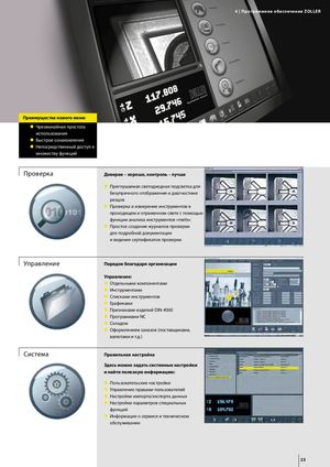 4 | Программное обеспечение ZOLLER Преимущества нового меню Чрезвычайная простота использования Быстрое ознакомление Непосредственный доступ к множеству функций Проверка Доверие – хорошо, контроль – лучше Приглушаемая светодиодная подсветка для безупречного отображения и диагностики резцов Проверка и измерение инструментов в проходящем и отраженном свете с помощью функции анализа инструментов »metis« Простое создание журналов проверки для подробной документации и ведения сертификатов проверки Управление Порядок благодаря организации Управление: Отдельными компонентами Инструментами Списками инструментов Графиками Признаками изделий DIN 4000 Программами NC Складом Оформлением заказов (поставщиками, валютами и т.д.) Система Правильная настройка Здесь можно задать системные настройки и найти полезную информацию: Пользовательские настройки Управление правами пользователей Настройки импорта/экспорта данных Настройки параметров специальных функций Информация о сервисе и техническом обслуживании 23