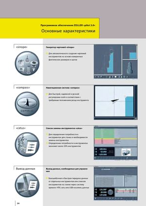 Программное обеспечение ZOLLER »pilot 3.0« Основные характеристики »sinope« Генератор чертежей »sinope« Для автоматического создания чертежей инструментов на основе измеренных фактических размеров и шагов »compass« Навигационная система »compass« Для быстрой, надежной и ручной регулировки осей в соответствии с требуемым положением резца инструмента »cetus« Список замены инструментов »cetus« Для определения потребности в инструментах для станка и необходимости замены инструментов Определение потребности в инструментах экономит около 50% инструментов Вывод данных Вывод данных, необходимых для управле- ния Безошибочная и быстрая передача данных от отдельных инструментов или списков инструментов на станки через систему прямого ЧПУ, сеть или USB-носитель данных 24