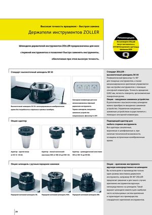 Высокая точность вращения – быстрая замена Держатели инструментов Zoller Рекомендация: Все шпиндели ZOLLER могут поставляться с Шпиндели держателей инструментов ZOLLER предназначены для всех автофокусировкой и датчиком вращения ROD стержней инструментов и позволяют быстро заменять инструменты, обеспечивая при этом высокую точность. Стандарт: высокоточный шпиндель SK 50 Стандарт ZOLLER – высокоточный шпиндель SK 50 Пневматический фиксатор 4 x 90° для токарных инструментов, а также механизированное крепление управляются при настройке инструментов с помощью сенсорной клавиатуры. Точность вращения 0,002 мм, легкость поворота, эргономическая поворотная ручка. Сенсорная клавиатура для всех Опция – вакуумное зажимное устройство механизированных функций В дополнение к высокоточному шпинделю Высокоточный шпиндель SK 50 с интегрированным калибровочным держателя инструмента. можно приобрести вакуумное зажимное краем без потребности в отдельных нулевых калибрах. Тормоз шпинделя, вакуумное устройство. Управление вакуумным зажимное устройство зажимным устройством осуществляется с (опционально), фиксатор 4 x 90°. помощью сенсорной клавиатуры. Опция: адаптер Подходящий адаптер для любого стержня инструмента Все адаптеры закаленные, вороненые и шлифованные и, при наличии технической возможности, оснащены встроенным калибровочным краем. Адаптер – крутой конус Адаптер – полый конический Адаптер – цилиндрический хвостовик от SK 10 - SK 60. хвостовик HSK от HSK 25 до HSK 125. VDI от VDI 16 до VDI 80. Опция: шпиндель с ручным передним зажимом Опция – крепление инструмента вручную непосредственно на шпинделе Вы используете в производстве только один размер хвостовика держателя инструмента, например SK 40? ZOLLER предлагает решение и для такого случая: крепление инструментов вручную непосредственно на шпинделе. Такой вариант шпинделя имеется для наиболее часто используемых систем крепления Передний натяжной шпиндель SK. Передний натяжной шпиндель HSK. Передний натяжной шпиндель KM. и гарантирует все преимущества стандартного крепления инструментов. 26