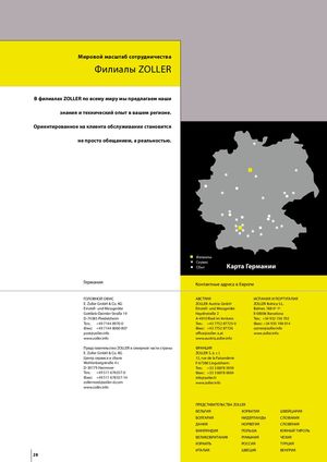 Мировой масштаб сотрудничества Филиалы ZOLLER В филиалах ZOLLER по всему миру мы предлагаем наши знания и технический опыт в вашем регионе. Ориентированное на клиента обслуживание становится не просто обещанием, а реальностью. n Филиалы « Сервис l Сбыт Карта Германии Германия Контактные адреса в Европе ГОЛОВНОЙ ОФИС АВСТРИЯ ИСПАНИЯ И ПОРТУГАЛИЯ E. Zoller GmbH & Co. KG ZOLLER Austria GmbH ZOLLER Ibérica S.L. Einstell- und Messgeräte Einstell- und Messgeräte Balmes 188 4º 1ª Gottlieb-Daimler-Straße 19 Haydnstraße 2 E-08006 Barcelona D-74385 Pleidelsheim A-4910 Ried im Innkreis Тел.: +34 932 156 702 Тел.: +49 7144 8970-0 Тел.: +43 7752 87725-0 Факс: +34 935 198 014 Факс: +49 7144 8060-807 Факс: +43 7752 87726 correo@zoller.info post@zoller.info office@zoller-a.at www.zoller.info www.zoller.info www.austria.zoller.info Представительство ZOLLER в северной части страны ФРАНЦИЯ E. Zoller GmbH & Co. KG ZOLLER S. à. r. l. Центр сервиса и сбыта 12, rue de la Faisanderie Wohlenbergstraße 4 c F-67380 Lingolsheim D-30179 Hannover Тел.: +33 3 8878 5959 Тел.: +49 511 676557-0 Факс: +33 3 8878 0004 Факс: +49 511 676557-14 info@zoller.fr zollernord@zoller-d.com www.zoller.info www.zoller.info ПРЕДСТАВИТЕЛЬСТВА ZOLLER БЕЛЬГИЯ ХОРВАТИЯ ШВЕЙЦАРИЯ БОЛГАРИЯ НИДЕРЛАНДЫ СЛОВАКИЯ ДАНИЯ НОРВЕГИЯ СЛОВЕНИЯ ФИНЛЯНДИЯ ПОЛЬША ЮЖНЫЙ ТИРОЛЬ ВЕЛИКОБРИТАНИЯ РУМЫНИЯ ЧЕХИЯ ИЗРАИЛЬ РОССИЯ ТУРЦИЯ ИТАЛИЯ ШВЕЦИЯ ВЕНГРИЯ 28