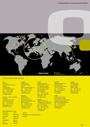 6 | Обслуживание и контактные данные ZOLLER Карта мира n Филиалы p Представительства Контактные адреса в других регионах США КАНАДА КИТАЙ СИНГАПУР ЯПОНИЯ ZOLLER Inc. ZOLLER Canada ZOLLER Shanghai, Ltd. ZOLLER Singapore Pte. Ltd. ZOLLER Japan KK Штаб-квартира в Северной 5659 McAdam Road Штаб-квартира в азиатско- 7500A Beach Road 5-14, Kawagisi-Cho Америке Unit A2 тихоокеанском регионе #04-320 the Plaza Singapore Suita-Shi, Osaka 3753 Plaza Drive CAN-L4Z 1N9 Mississauga, ON No. 1588 ZhuanXing Road 199591, Singapore 564-0037, JAPAN USA-48108 Ann Arbor, MI Тел.: +1 905 712 0100 Xin Zhuang Industry Park Тел.: +91 20 2749 6118 Тел.: +81 6 6170 2355 Тел.: +1 734 332 4851 Факс: +1 905 712 1623 Min Hang District Факс: +91 20 2749 6114 Факс: +81 6 6381 1310 Факс: +1 734 332 4852 sales@zoller-usa.com 201108 Shanghai post@zoller.info info@zoller-jp.com sales@zoller-usa.com www.zoller-usa.com Тел.: +86 21 3407 3978 www.zoller.info www.zoller-jp.com www.zoller-usa.com Факс: +86 21 6442 2622 МЕКСИКА info@zoller-cn.com ИНДИЯ ZOLLER Inc. / Офис на Западном ZOLLER Mexico www.zoller-cn.com ZOLLER India Private Ltd. побережье Calle 53, LT-24, C-21 Plot No. RM 104, 'G' Block 4025 Spencer St., Suite 202 Bosques de la Hacienda ГОНКОНГ Sanjeevani Complex, Shahu Nagar, USA-90503 Torrance, CA MEX-C.P. 54715 Cuautitlan Izcalli ZOLLER Asia Pacific, Ltd. Near KSB Chowk, Chinchwad, Тел.: +1 424 247 0180 Estado de México 10A Seapower Industrial Centre Pune 411019 Maharashtra, India Факс: +1 424 247 0184 Тел.: +52 55 5817 4654 177 Hoi Bun Road, Kwun Tong Тел.: +91 20 2749 6118 sales@zoller-usa.com Факс: +52 55 5817 4565 Kowloon, Hong Kong Факс: +91 20 2749 6114 www.zoller-usa.com sales@zoller-usa.com Тел.: +86 21 3407 3978 info@zoller-in.com www.zoller-usa.com Факс: +86 21 6442 2622 www.zoller.info info@zoller-cn.com www.zoller.info ПРЕДСТАВИТЕЛЬСТВА ZOLLER АРГЕНТИНА КОРЕЯ ТАЙЛАНД АВСТРАЛИЯ МАЛАЙЗИЯ ОБЪЕДИНЕННЫЕ АРАБСКИЕ ЭМИРАТЫ БРАЗИЛИЯ ПАКИСТАН ВЬЕТНАМ ЧИЛИ СИНГАПУР ИНДОНЕЗИЯ ЮЖНАЯ ИРАН АФРИКА КОЛУМБИЯ ТАЙВАНЬ 29