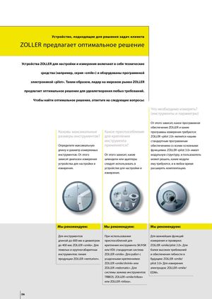 Устройство, подходящее для решения задач клиента ZOLLER предлагает оптимальное решение Устройства ZOLLER для настройки и измерения включают в себя технические средства (например, серия »smile«) и оборудованы программной электроникой »pilot«. Таким образом, лидер на мировом рынке ZOLLER предлагает оптимальное решение для удовлетворения любых требований. Чтобы найти оптимальное решение, ответьте на следующие вопросы: Что необходимо измерять? (инструменты и параметры) От этого зависит, какое программное обеспечение ZOLLER и какие Каковы максимальные Какое приспособление программы измерения требуются: размеры инструментов? для крепления ZOLLER »pilot 2.0« является нашим инструмента стандартным программным Определите максимальную применяется? обеспечением со всеми основными длину и диаметр измеряемых функциями. ZOLLER »pilot 3.0« имеет инструментов. От этого От этого зависит, какие модульную структуру, и пользователь зависит диапазон измерения шпиндели или адаптеры может решать, какие модули устройства для настройки и следует использовать в ему требуются, и в любое время измерения. устройстве для настройки и расширять комплектацию. измерения. BМei ыWeрrkеzкeuоgмenенvoдnуbеiмs z:u 600 mm inМLäыngрeекомендуем: Мы рекомендуем: und Durchmesser 400 mm: »smile« für schwere und größere Werkzeuge: die »vДeлnяtuиriнoсnт«рPуrмoеdнuтkоtlвinie. При использовании Для важнейших функций длиной до 600 мм и диаметром приспособлений для измерения и проверки: до 400 мм: ZOLLER »smile«. Для крепления инструмента SK/HSK ZOLLER »smile/pilot 2.0«. Для тяжелых и крупногабаритных или VDI: стандартная система более высоких требований инструментов: линия ZOLLER »smile«. Для работ с и обеспечения гибкости в продукции ZOLLER »venturion«. усадочными креплениями: будущем: ZOLLER »smile/ ZOLLER »smile/shrink« или pilot 3.0« Для измерения ZOLLER »redomatic«. Для электродов: ZOLLER »smile/ системы зажима инструментов EDM«. TRIBOS: ZOLLER »smile/tribos« или ZOLLER »tribos«. 06