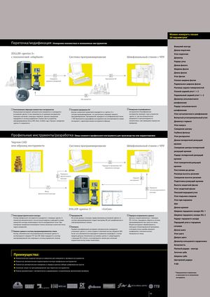 Можно измерить свыше 50 параметров* Переточка/модификация | Измерение неизвестных и изношенных инструментов Внешний контур Длина подточки ZOLLER »genius 3« Угол подточки с технологией »elephant« Система программирования Шлифовальный станок с ЧПУ Диаметр Радиус угла Длина фасета Ширина фаски Длина фаски Угол фаски Передача Программа NCданных измерений Осевая ширина фаски Радиальная ширина фаски Разница задних поверхностей Осевой задний угол 1 + 2 Радиальный задний угол 1 + 2 Инструменты Диаметр затыловочного шлифования Радиус затыловочного Распознавание образцов неизвестных инструментов 2 Создание программы NC 3 Измерение отшлифованных шлифования Изношенный инструмент автоматически измеряется и сканируется Данные измерений параметров передаются из »genius 3« в инструментов Отшлифованные установкой »genius 3« вне зависимости от размеров инструмента/ систему программирования, что значительно сокращает процесс инструменты проходят через устройство Угол затыловочного шлифования плановых значений с помощью »elephant«. Данные измерений программирования. Программа NC передается на шлифовальный станок »genius 3«, где они автоматическипередаются в систему управления станком или в устройствос ЧПУ. Выполняется дошлифовка инструмента или изготавливается новыйизмеряются и протоколируются в Вогнутый угол/центральный угол программирования (Anca, MTS, Num, Schütte и др.). Процесс измерения инструмент с характеристиками инструмента-образца. соответствии с уже имеющимся процессом Диаметр стержня »genius 3« сохраняется. измерения. Угол конуса Смещение центра Глубина фальца Профильные инструменты/разработка | Ввод сложного профильного инструмента для производства или корректировки Угол раскрытия Длина поперечной режущей Чертеж CAD кромки или образец инструмента Система программирования Шлифовальный станок с ЧПУ Смещение центра поперечной режущей кромки Радиус поперечной режущей кромки Угол поперечной режущей Передача программы NC/ кромки планового контура Расстояние до резца Передача Разница высоты резания фактическогоконтура Первый Смещение высоты резания инструмент Подготовка режущей кромки Высота защитной фаски Передача Угол защитной фаски оптимизированного Вводфактического контура контура Плоский передний угол Угол подъема спирали Угол при вершине Шаг ZOLLER »genius 3« »CoCon« Длина кромки Ширина торцевого зазора SSL 1 Регистрация фактического контура 3 Программа NC 5 Передача исправленных данных Ширина торцевого зазора SSL 2 Контур профильного инструмента сканируется с помощью »genius 3« На основе данных о контуре, предоставляемых установкой »genius 3«, Данные, скорректированные с помощью Радиус торцевого зазора полностью автоматически с точностью до микрона и выводится в виде система программирования создает программу NC для шлифовальных и ПО »CoCon«, передаются обратно в систему замкнутого контура, включающего тысячи координатных точек. При электроэрозионных станков. программирования или сразу на станок. Передний угол в торцевом повторном измерении используются только начальная и конечная точки Второй инструмент обрабатывается с задачи измерений. 4 Контроль помощью оптимизированной программы, сечении Первый отшлифованный инструмент автоматически сканируется в которой учтены ошибки прежнего Длина шага 2 Перенос данных в систему программирования/на
